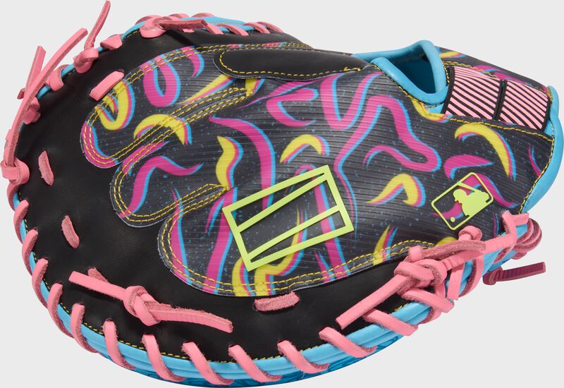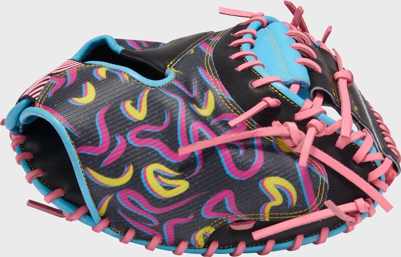 This glove brings heat with a wild Columbia Blue and Black sublimated back, accented by neon squiggles and sharp pink laces for an electric look. The Columbia Blue palm is built with top-tier leather and REV1X technology to deliver elite-level durability, comfort, and structure. With a 34-inch CM43 pattern and solid one-piece web, this mitt is made to own the zone.